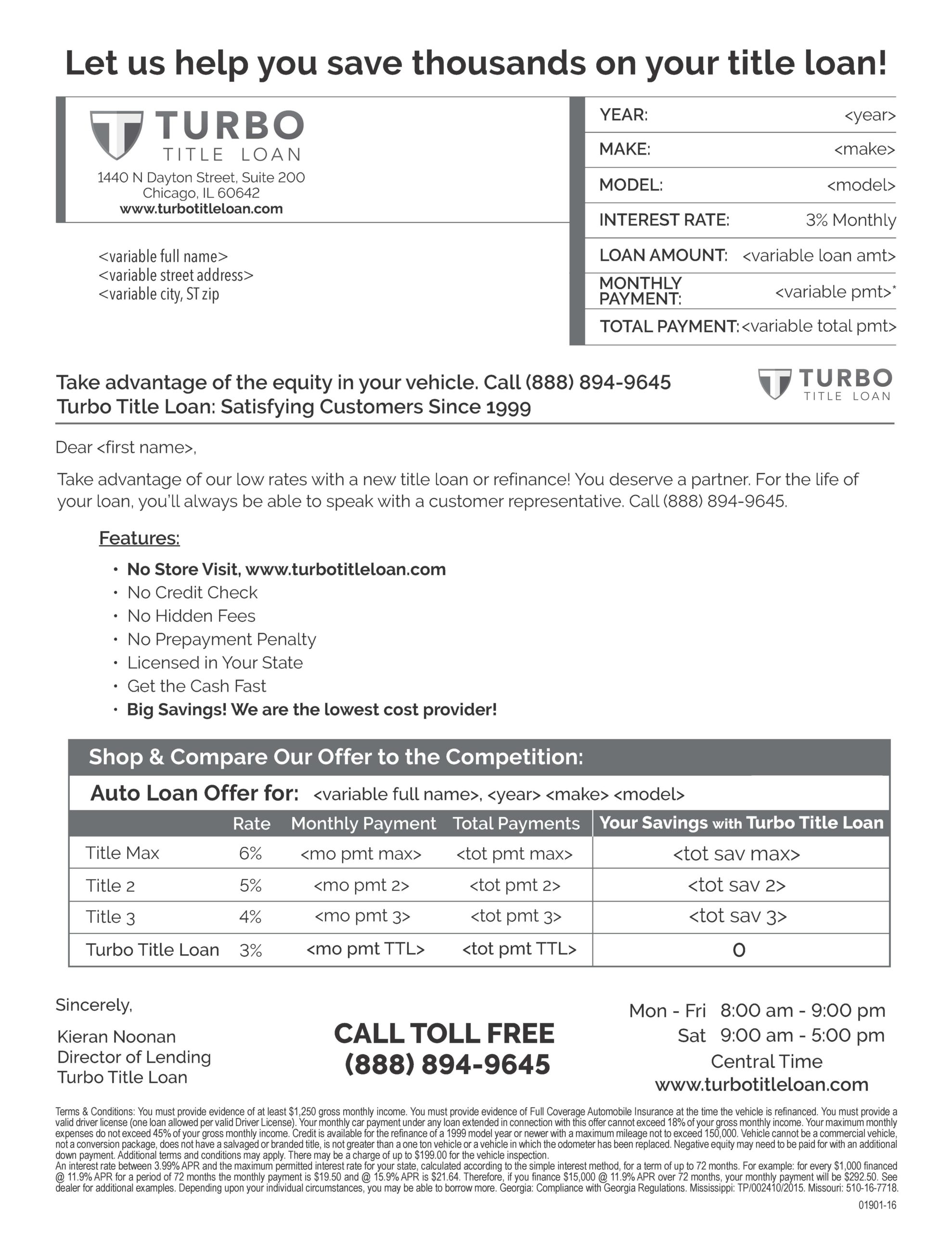- Title loans—help people avoid being turned off by misinformation about automotive title loans by explaining the facts in a mailer.